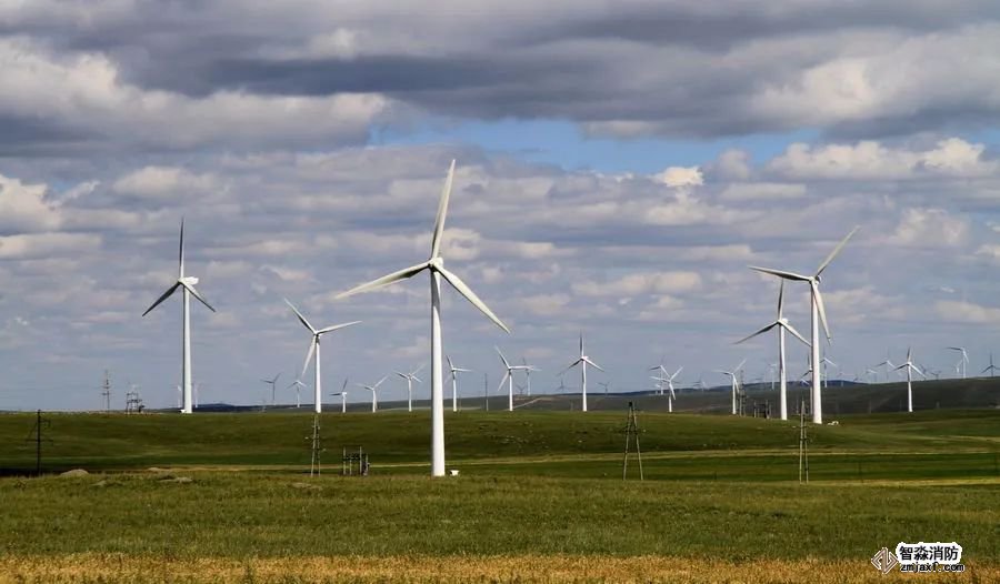 风能作为清洁环保的可再生能源,具有传统能源不可比拟的优越性,也是再生能源中技术最成熟、最具规模的一种。风力发电机组主要由叶轮、机舱和塔架三部分构成。机舱内装有传动系统(包括主轴、齿轮箱和联轴节)、偏航系统(包括偏航电机、偏航轴承等)、液压系统(包括电动机、油泵、油箱和液压阀等)、制动系统(包括空气动力制动装置和机械刹车制动装置)、发电机和控制系统。其中发电机、齿轮变速箱、制动刹车系统、机舱底座、润滑散热系统、照明系统、传输电缆、控制柜等部件都是潜在的火灾危险源。风力发电机组在长期运行中很容易产生摩擦过热、制动过热、润滑油泄漏、电缆过流绝缘老化、控制柜电器元件过热击穿短路、发动机内部过热短路等,机组遭遇雷电、大风大雾雨雪等极端恶劣天气也会导致火灾事故的发生。目前,风电机舱内采用的可燃物包括润滑油、液压油、高压软管、隔音海绵、电线电缆、密封材料等;这些材料一旦被引燃,火焰会在短时间内蔓延至整个机舱内部空间,导致其他可燃物同时燃烧,火势无法控制直至风力发电机组完全燃烧。塔架底部电器柜中电器元件过载击穿短路、雷击,同样会导致大火,使风力发电机组烧损,若安装在草原或森林附近,则造成草原或森林大火。火灾是风力发电机组最为致命的灾害之一,风电机组距地面的垂直高度几十米至一百多米,再加上周围地形环境复杂,消防队员及时赶到也望而却步,无法实施有效的灭火救援工作,只能等待整个风力发电机组完全烧毁。风力发电机组灭火,是在风力发电机组内安装火灾自动探测报警控制系统和自动灭火系统,实施防火和灭火自动保护。