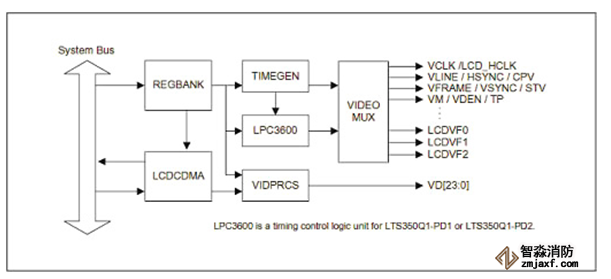 同时 TIMEGEN 和 LPC3600 负责产生 LCD屏所需要的控制时序,例如VSYNC、HSYNC、VCLK、VDEN,然后从 VIDEO MUX 送给LCD屏。