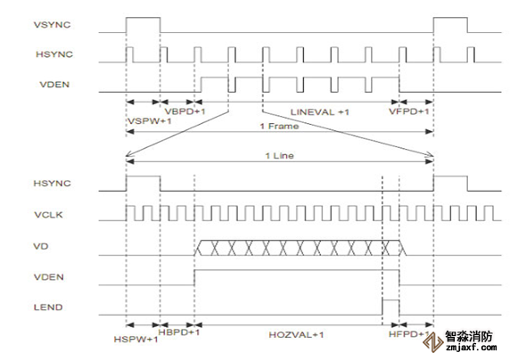 图上是TFT屏的典型时序。其中VSYNC是帧同步信号,VSYNC每发出1个脉冲,都意味着新的1屏视频资料开始发送。而HSYNC为行同步信号,每个HSYNC脉冲都表明新的1行视频资料开始发送。而VDEN则用来标明视频资料的有。